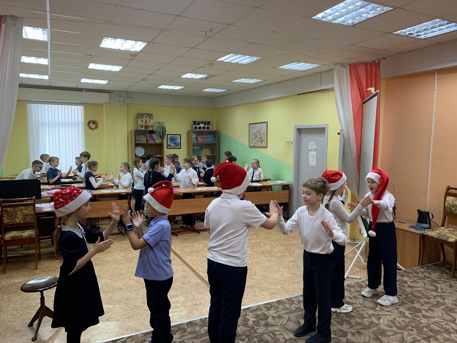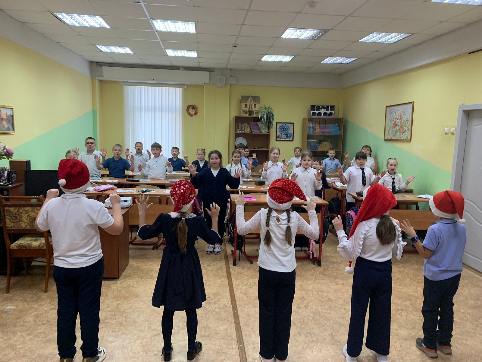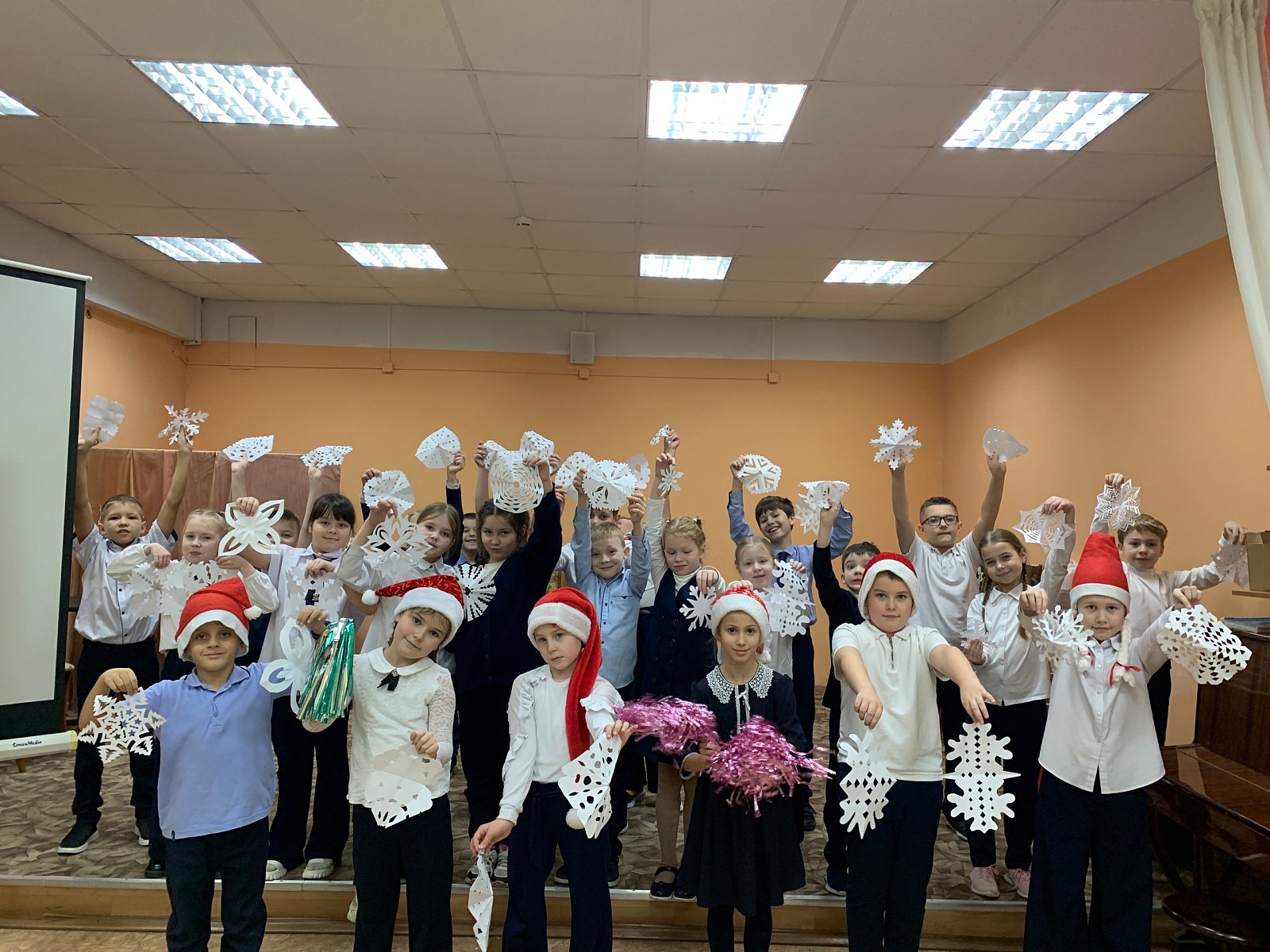 Вместе исполнили новогоднюю песню со снежинками, приготовленными заранее.